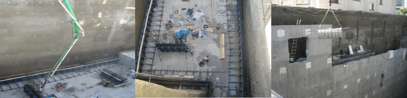 | عمق و شکل خاص گود برداري و داشتن فندانسيون پله اي با اختلاف ارتفاع 3 متر و ريختن حدود 800 متر مکعب بتن ريزي در يک روز گود برداري 22 متر زيرزمين آن هم در صورتي که عمق گود از عرض گود 6-7 متر بيشتر بوده (در آوردن راه پله در گودبرداري و برش خاک) |